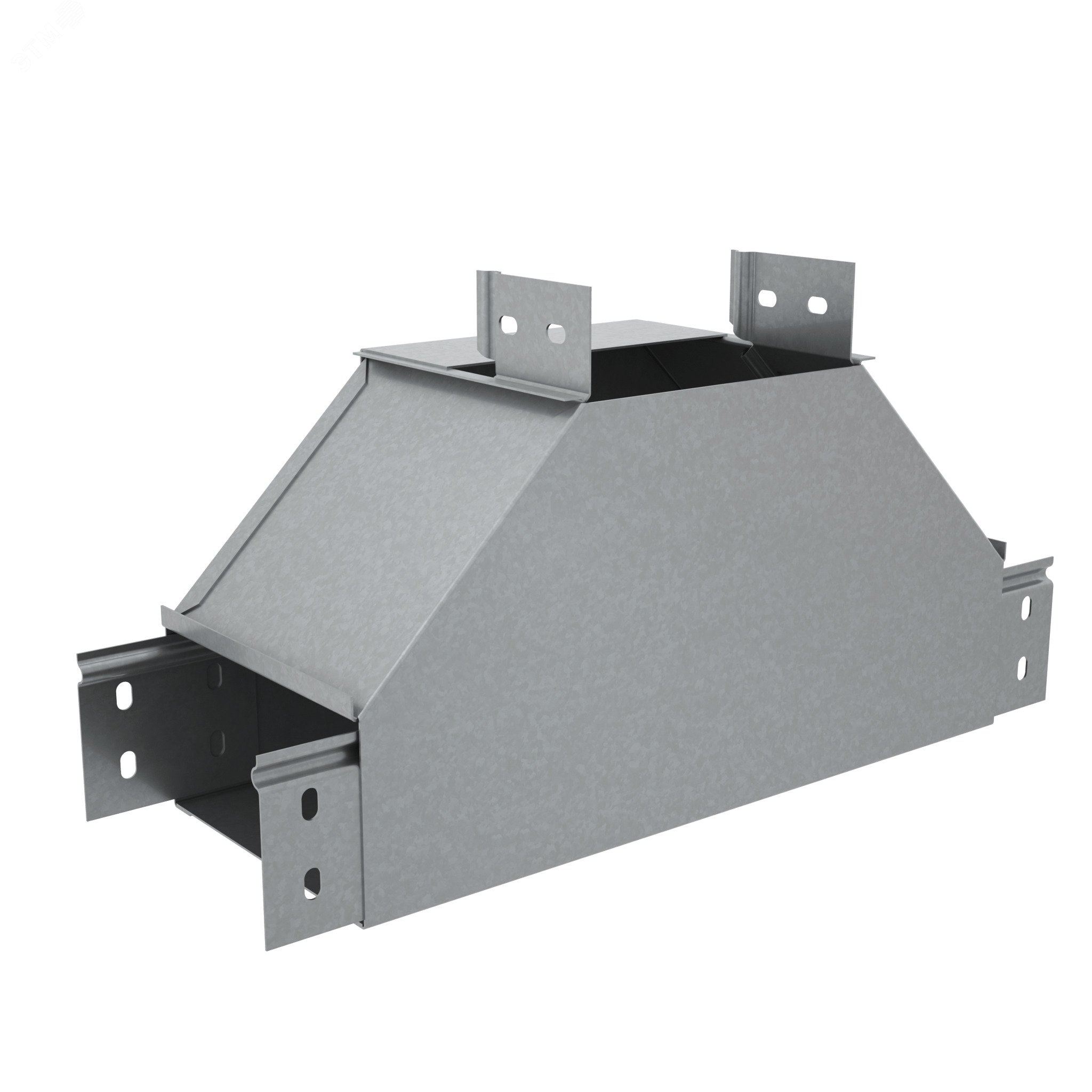 Для обеспечения заданных радиусов изгиба кабельной трассы при монтаже используется Т-отвод вертикальный вверх серии ''PLUS''. Конструкция элемента применима для отвода трассы вверх, при этом разворачивая открытую часть металлического лотка вокруг своей оси на 90 градусов. Элемент рекомендовано использовать c металлическим листовым лотком этой же серии шириной 150 мм и высотой борта 100 мм. Изделие оцинковано методом горячего погружения согласно ГОСТ 9.307-89 и используется для монтажа в помещениях с высокой влажностью и низкой загрязненностью, под открытым небом и в слабокоррозийной среде, в соответствии с ГОСТ15150-69. Т-отвод легко монтируется с помощью метизов. Специальные соединительные лепестки на корпусе секции обеспечивают необходимую жёсткость конструкции стыкового узла и целостность трассы.
