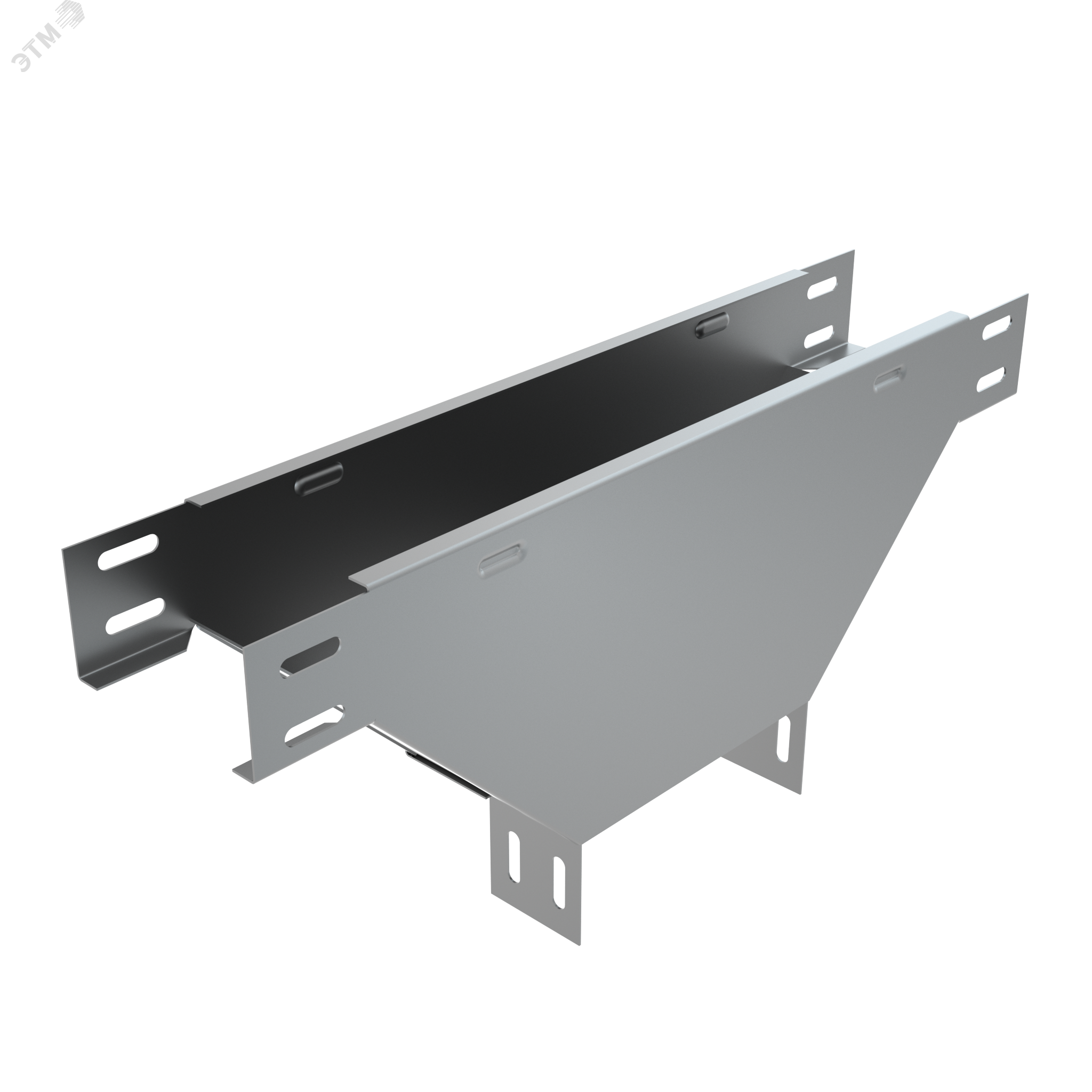 Т-ответвитель переходник вертикальный c разворотом трассы на 90 градусов БАЗОВОЙ СЕРИИ, в конструкции которого нижняя часть больше исходной, используется для отвода трассы вниз, при этом разворачивая открытую часть лотка вокруг своей оси под прямым углом. Применяется для организации плавных поворотов и позволяет осуществить переход трассы с исходной ширины лотка 150 мм на ширину 300 мм. Изделие выполнено из стали и оцинковано по методу Сендзимира. Предназначено для применения в местах предпочтительно с сухим климатом, внутри помещений и в слабоагрессивных средах, в соответствии с ГОСТ15150-69. Элемент предупреждает повреждение кабеля при прокладке и позволяет рационально использовать внутренний объем.