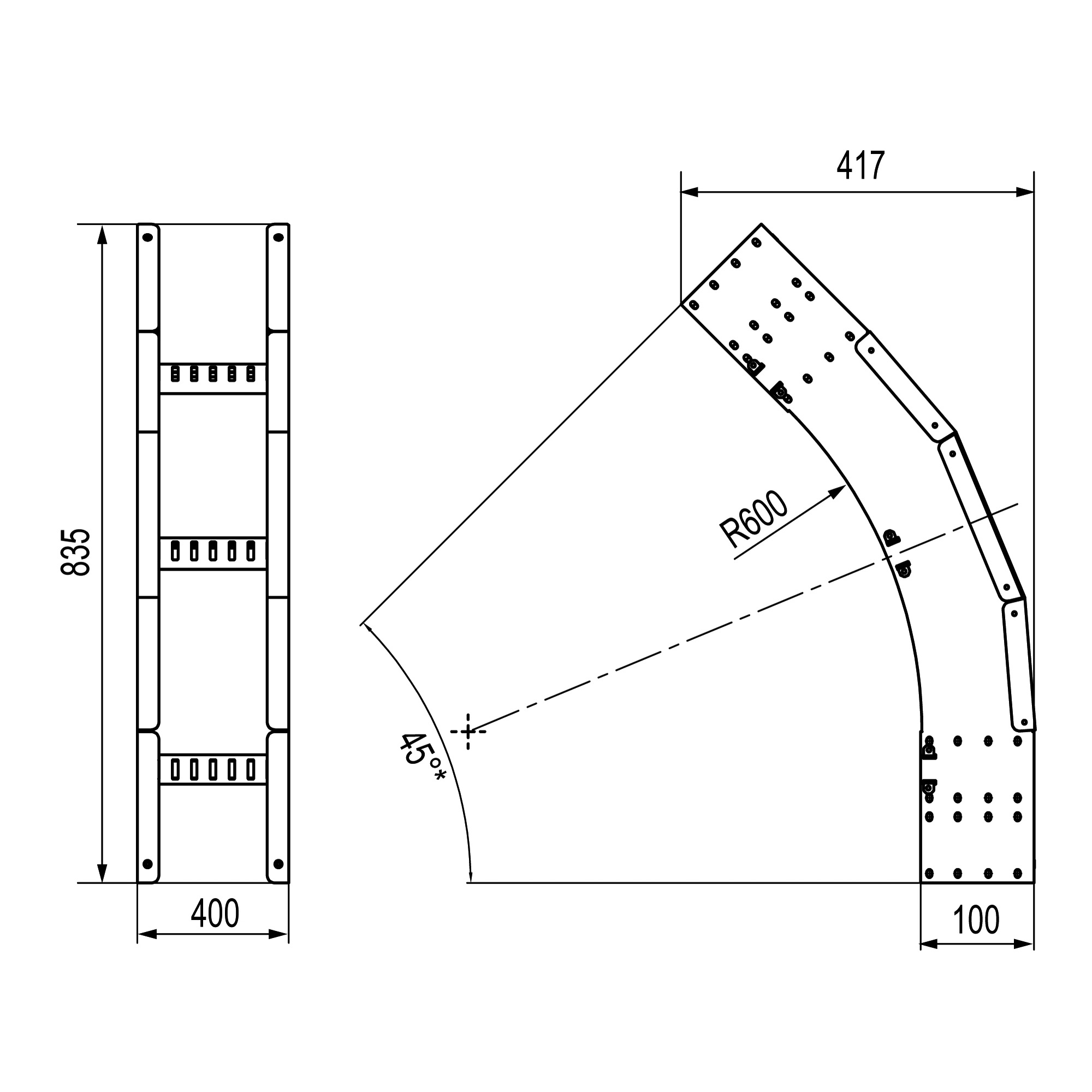 Угол лестничный вертикальный внешний 45 градусов 100х400, R600, горячеоцинкованный