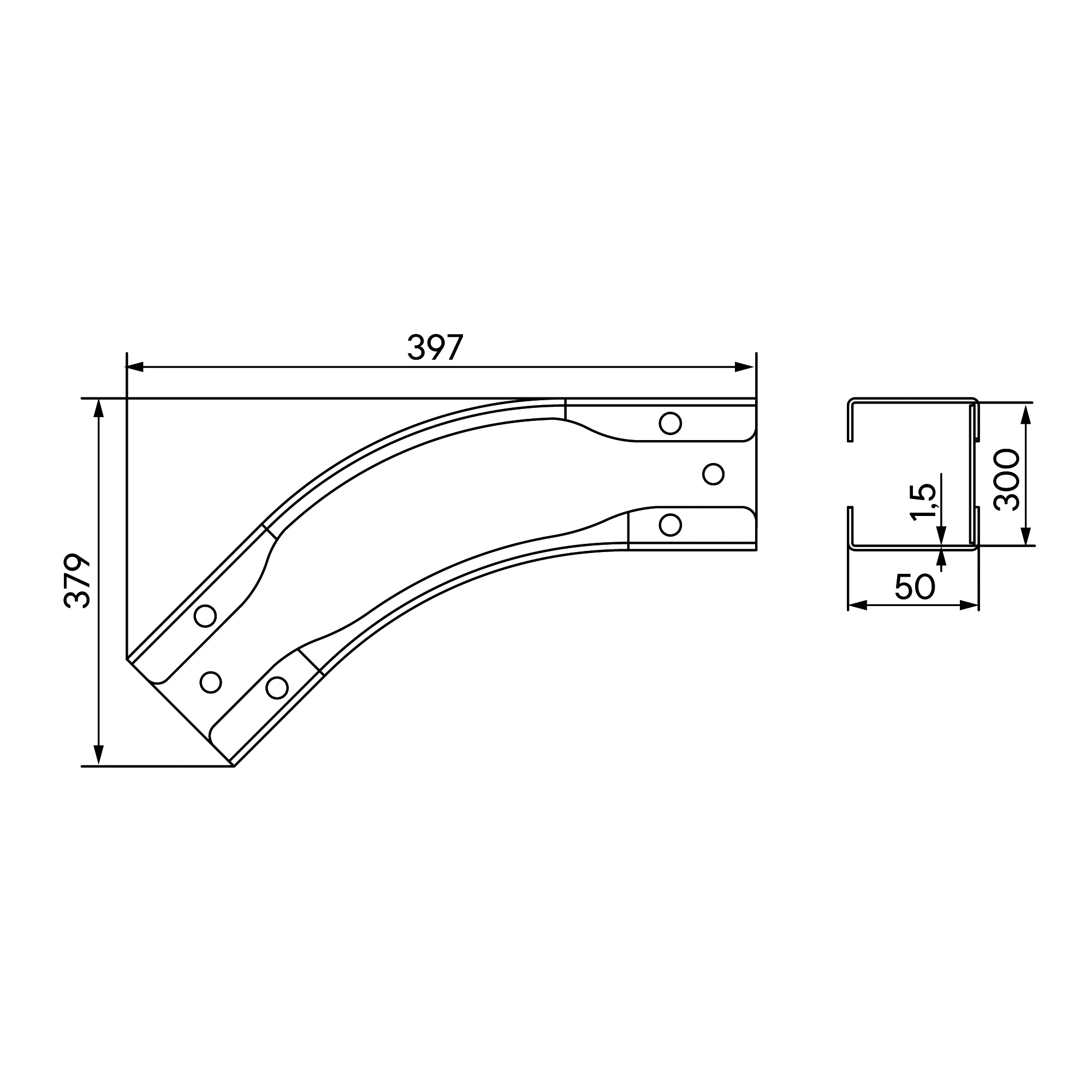 Угол горизонтальный 45 градусов 50х300, 1,5 мм, AISI 304 в комплекте с крепежными элементами и соединительными пластинами, необходимыми для монтажа