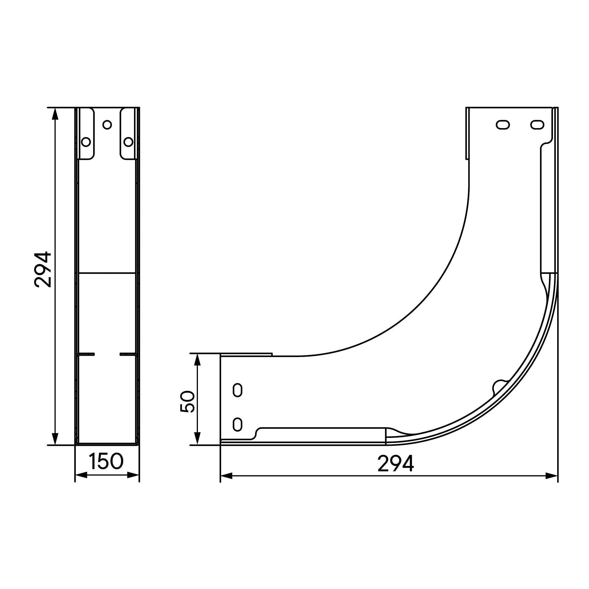 Угол вертикальный внутренний 90 градусов 50х150, 0,8 мм, AISI 304 в комплекте с крепежными элементами и соединительными пластинами, необходимыми для монтажа