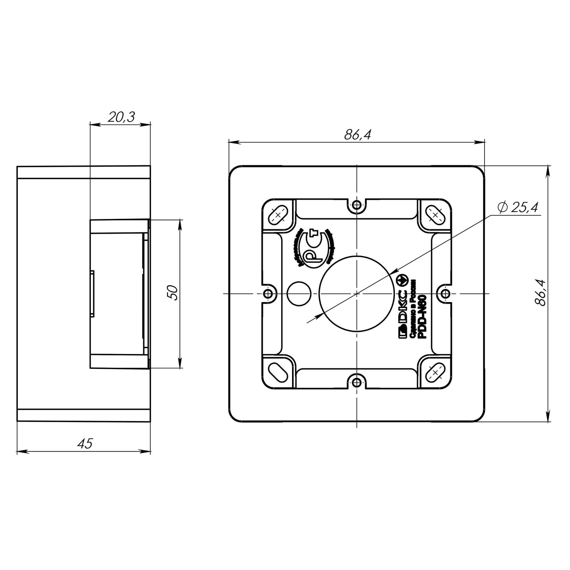 Коробка монтажная под 2 модуля электроизделий, тип PDD-N60. Назначение: организация рабочего места. Условия монтажа электроустановочных изделий: с каркасами и рамками (аналогично как в стены), посадочный размер между винтами 60 мм. Характеристики: материал – АБС-пластик; отверстия 50х20 мм с 3-х сторон для ввода