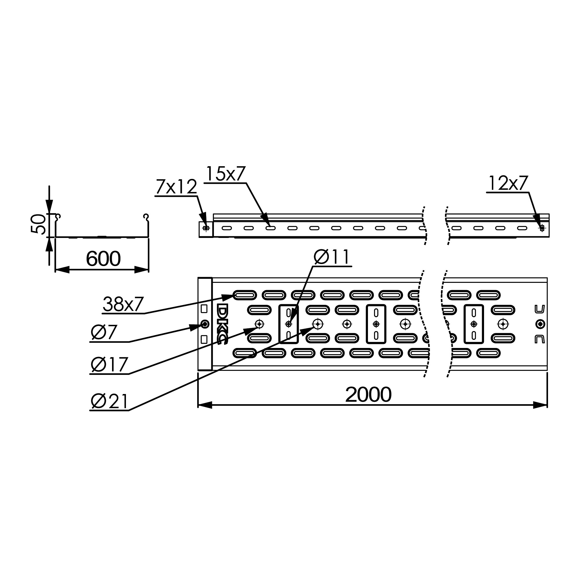 Перфорированный лоток предназначен для прокладки кабеля внутри помещения или под навесом. Выполнен в исполнении "сталь, оцинкованная по методу Сендзимира". Лоток отличается высокой несущей способностью – подформовка, производимая при производстве этой продукции, создает дополнительное ребро жесткости, что увеличивает несущую способность системы до 54%. Перфорация сокращает вес конструкции. В лотке имеются отверстия для отвода кабеля диаметром 11 мм, 17 мм, 21 мм. Лотки соединяются внахлест с помощью фирменного соединения "мама-папа", с использованием трех винтов и трех гаек. Это существенно сокращает время монтажа и обеспечивает непрерывный контур заземления. Конструктив лотка предупреждает повреждение кабеля при прокладке. Толщина стали – 1 мм, высота лотка – 50 мм, ширина – 600 мм, длина – 2000 мм. Полезное сечение – 29900 мм.