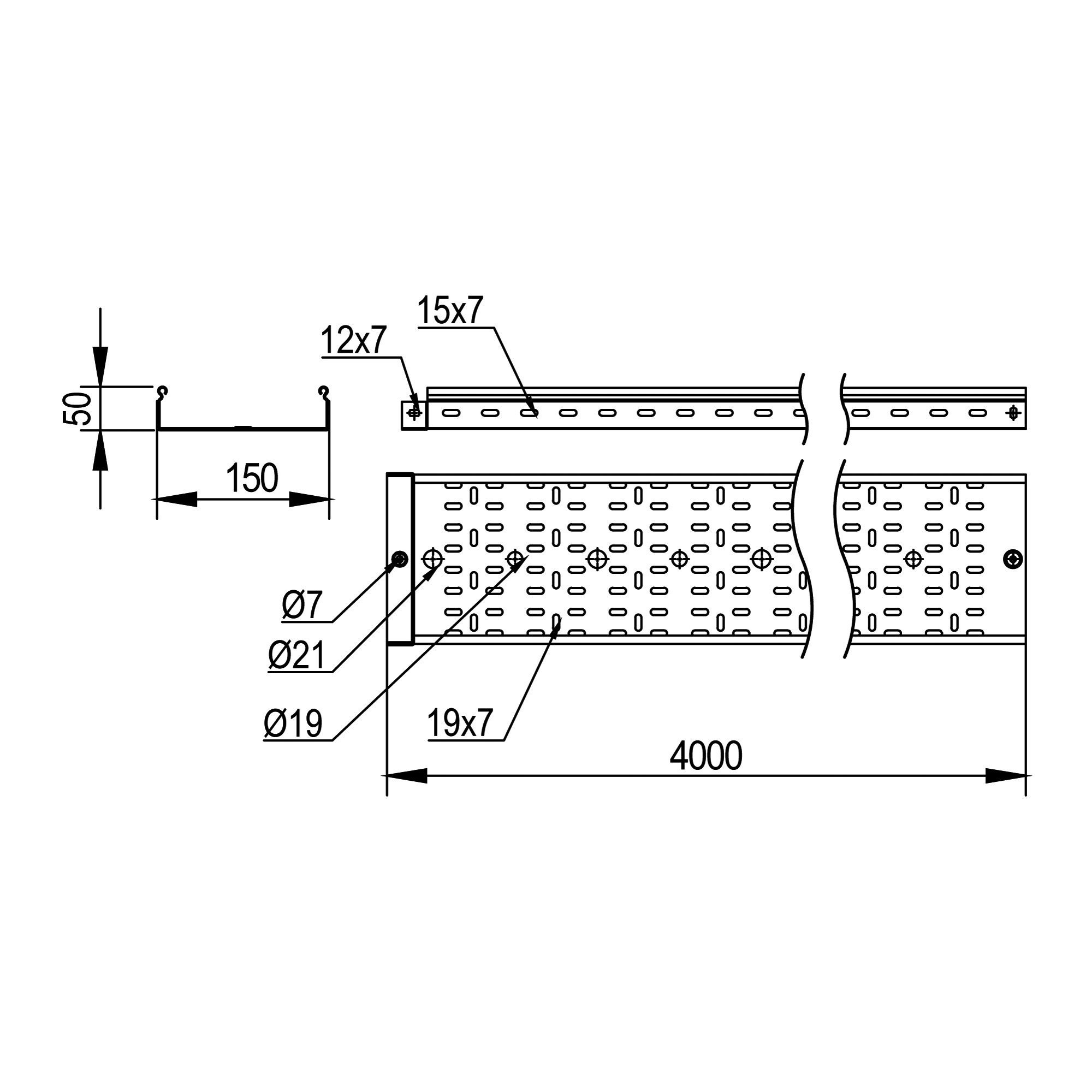 Лоток перфорированный 50x150х4000, 2,0 мм, цинк-ламельный
