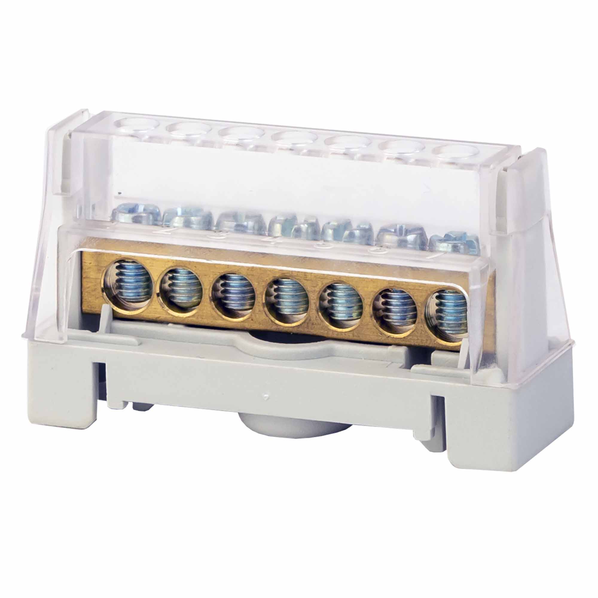 Шина латунная в корпусе на DIN рейку 1 полюс до 63A 13конт. под сеч. 16кв.мм, 2конт. под сеч. 25кв.мм, серая