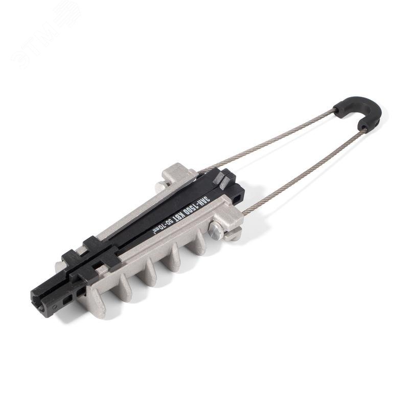 Предназначен для крепления СИП с изолированной несущей нейтралью к кронштейнам и крюкам опор линий ВЛИ. Зажим представляет собой литой корпус из коррозионно-стойкого алюминиевого сплава, тросика из нержавеющей стали и полимерных клиньев. Саморегулируемые клинья из полимера, стойкого к ультрафиолетовому излучению и погодно-климатическим условиям, зажимают провод нейтрали без повреждения изоляции. Гибкий тросик с изолированным погодостойким седлом позволяет монтировать до трех зажимов на кронштейне. Не требуют инструмента для монтажа. Нет выпадающих деталей. Вес - 0.32 кг