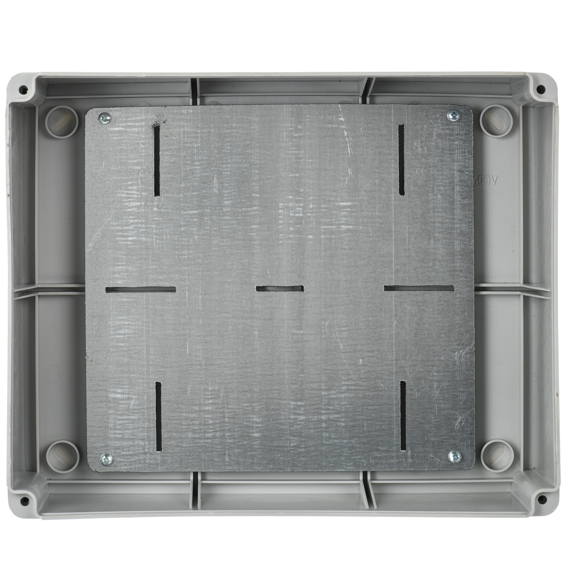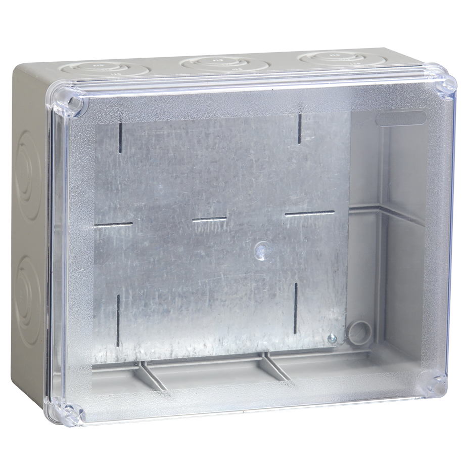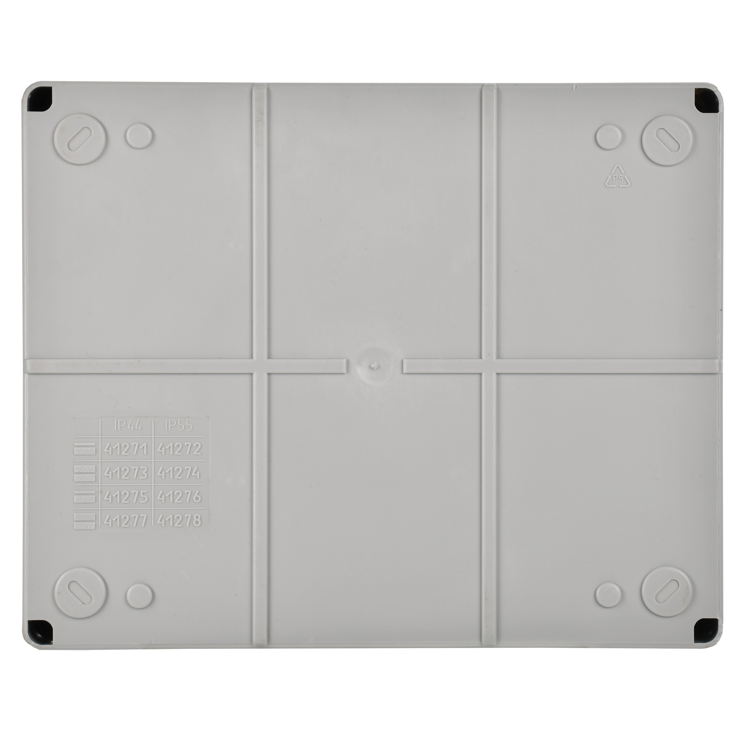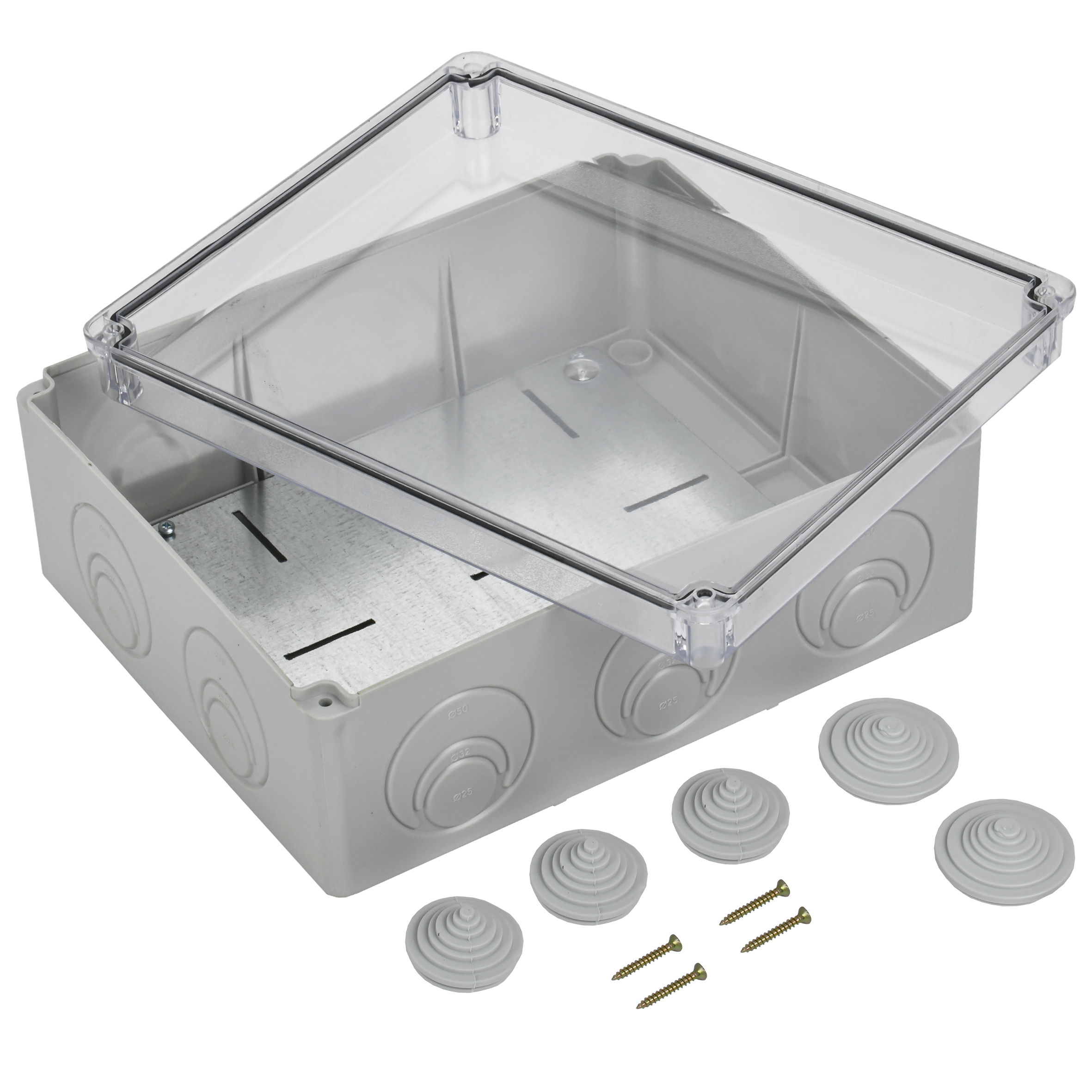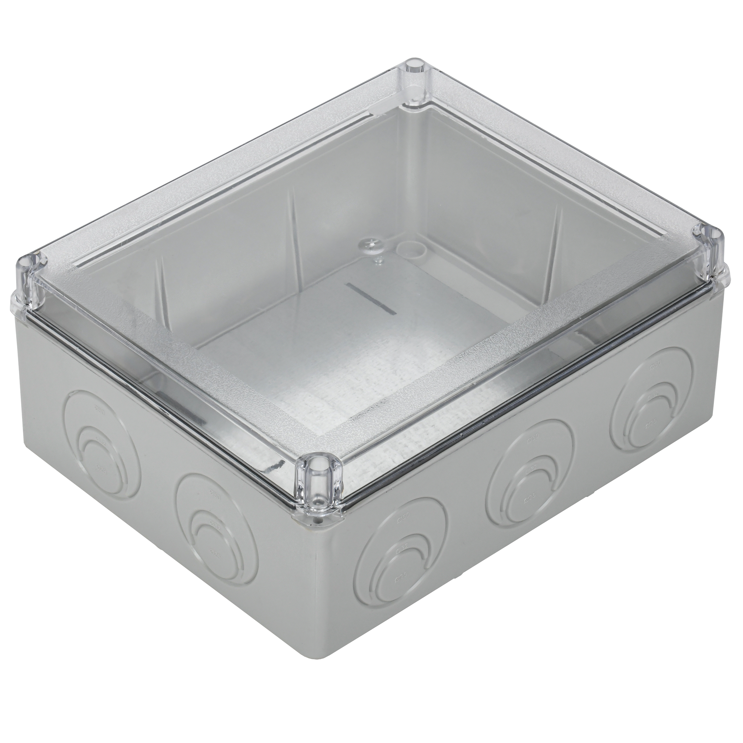 Коробка распаячная КМ41346 для открытой проводки безгалогенная (HF) 240х195х90мм с монтажной платой с прозрачной крышкой IP55 5 вводов серая IEK