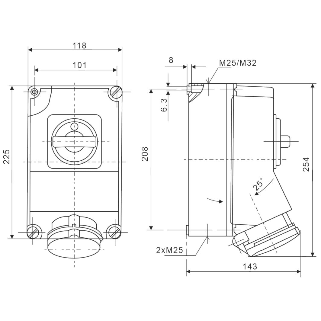 Розетка настенная с механической блокировкой и боковым расположением разъема WIS IP44 16А 2P+E 230В