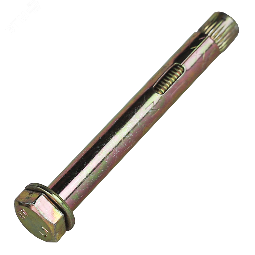 Применяется для крепления тяжеловесных конструкций к бетону, строительному камню и полнотелому кирпичу. Также может применяться для крепления к тонким бетонным перегородкам. Конструкция анкерного болта включает в себя следующие элементы - стальной стержень с резьбой и шестигранной головкой, конусную гайку, шайбу и подвижную муфту. При закручивании болта происходит распирание муфты конусной гайкой, что обеспечивает прочное и надежное крепление. Конструкция, скрепленная анкерами такого типа способна выдерживать высокие нагрузки.