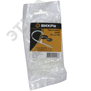 Хомут нейлоновый ''Вихрь'' (стяжка) — соединительный элемент, применяется для крепления и фиксации различных конструкций, систем монтажа, электропроводки и многого другого. Может использоваться при маркировке электромонтажных кабелей, т.к хомут одновременно выполняет функции крепежного изделия и стяжки для электропроводов. Хомуты являются достаточно быстрым и удобным способом крепления и бандажирования, также их можно использовать как в помещении, так и за его границами. Преимущества нейлоновых хомутов - Устойчив к ультрафиолету. Температурный диапазон эксплуатации от -20 С до +50 С.Эластичность Разрывопрочность кг/см3>200. Поставляется пакетами по 100 шт.