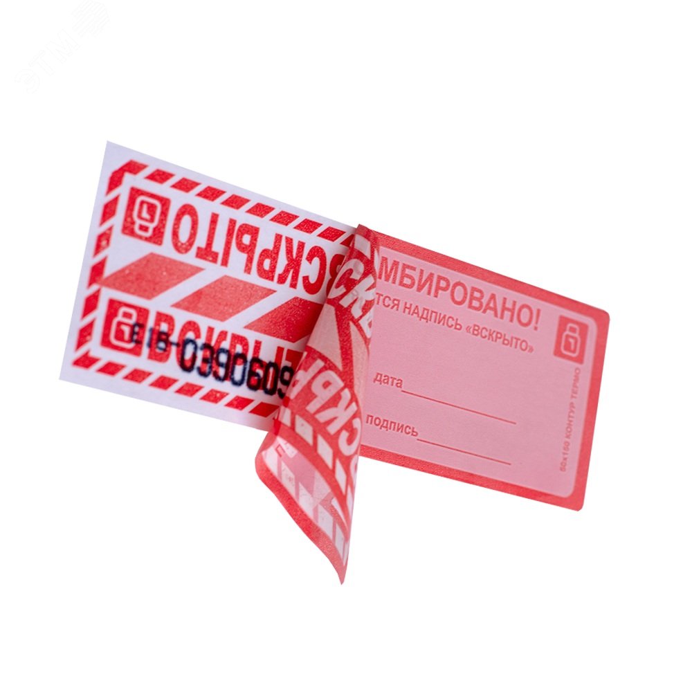 "Представляет собой самоклеющуюся этикетку на специальной подложке, выполненную из полиэстера с высокоадгезивным клеевым слоем. При попытке отклеивания от опломбируемой поверхности проявляются надписи """"ВСКРЫТО"""" и значок производителя, не исчезающие при повторном наклеивании. Воздействие на наклейку высокой температурой приводит к необратимому потемнению изделия, что служит дополнительной защитой. Каждая наклейка имеет свой нестираемый индивидуальный номер, который остается на опломбируемой поверхности, что исключает возможность подмены. Содержит поля """"дата"""" и """"подпись"""" для удобства в работе. Подходит для пломбирования любых чистых поверхностей."