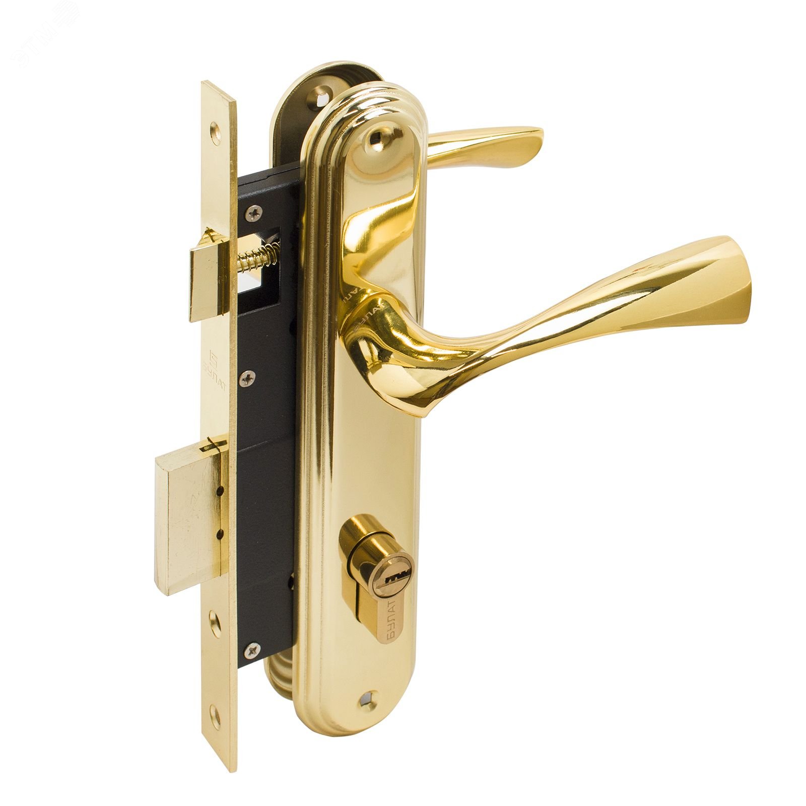 БУЛАТ ЗВ4-1.03.05 НОМОС золото 5 перф.кл. Замок врезной с/руч (12). Замок врезной с ручками. Предназначен для установки в деревянные двери толщиной 35-45 мм, правого и левого открывания. Дверь может быть закрыта на защелку и открыта с помощью фалевой ручки при открытом засове замка. Один плоский стальной ригель размером 20х44мм. Универсальная защелка. Стальной корпус с подшипником, покрыт полимерной краской. Межосевое расстояние 85 мм. Удаление ключевого отверстия 45мм. Материал ручек - сплав ЦАМ. Комплектация -латунный цилиндровый механизм 62мм, 5 перфоключей, ответная планка, винтовые стяжки.