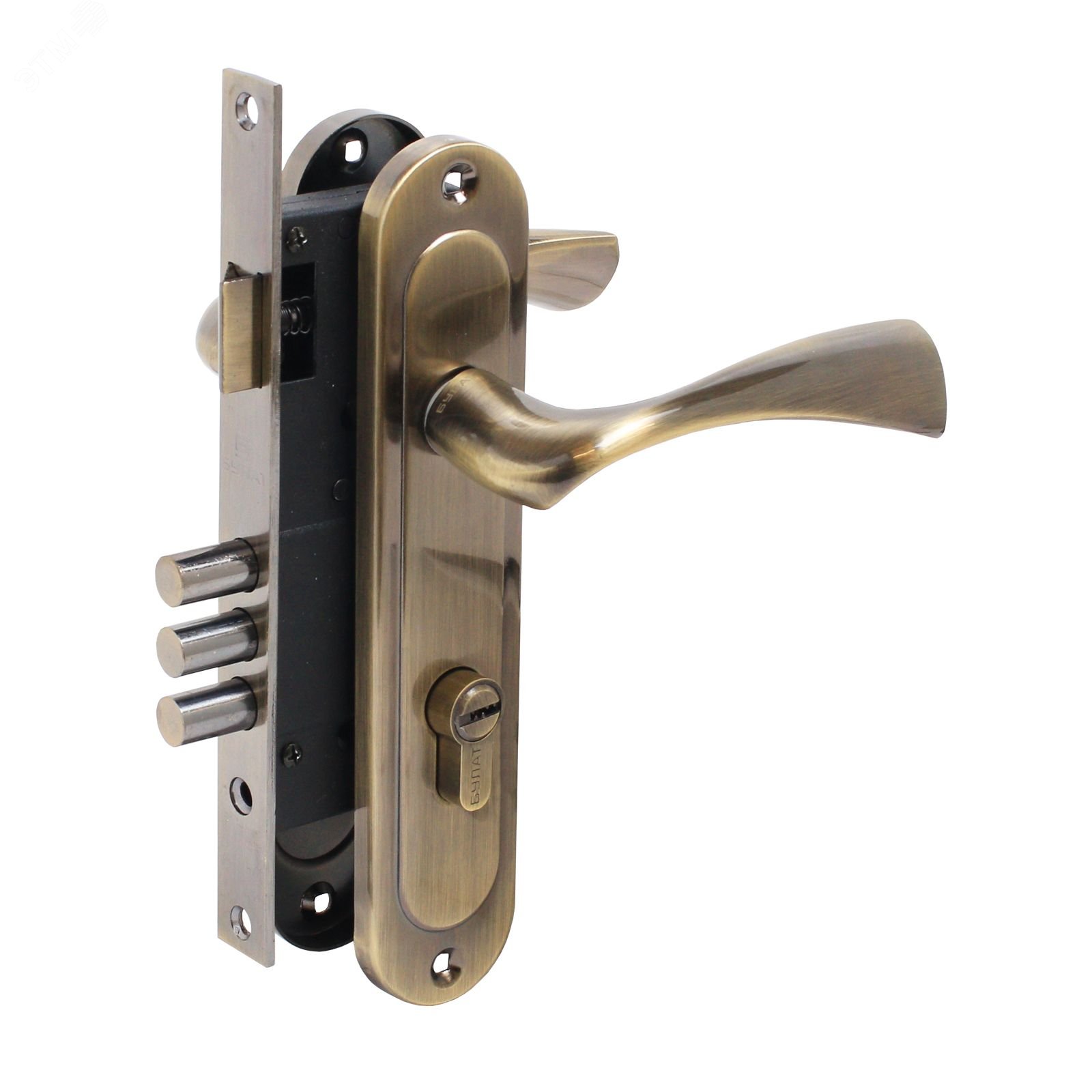 БУЛАТ ЗВ4-3.70.03.01 НОМОС бронза 5 перф.кл. Замок врезной с/руч (12). Замок врезной с ручками. Предназначен для установки в деревянные двери толщиной 35-45 мм, правого и левого открывания. Дверь может быть закрыта на защелку и открыта с помощью фалевой ручки при открытом засове замка. Три круглых стальных ригеля диаметром 12 мм. Универсальная защелка. Стальной корпус покрыт полимерной краской. Межосевое расстояние 70 мм. Удаление ключевого отверстия 45мм. Материал ручек - алюминиевый сплав. Комплектация - латунный цилиндровый механизм 62мм, 5 перфоключей, ответная планка, винтовые стяжки.