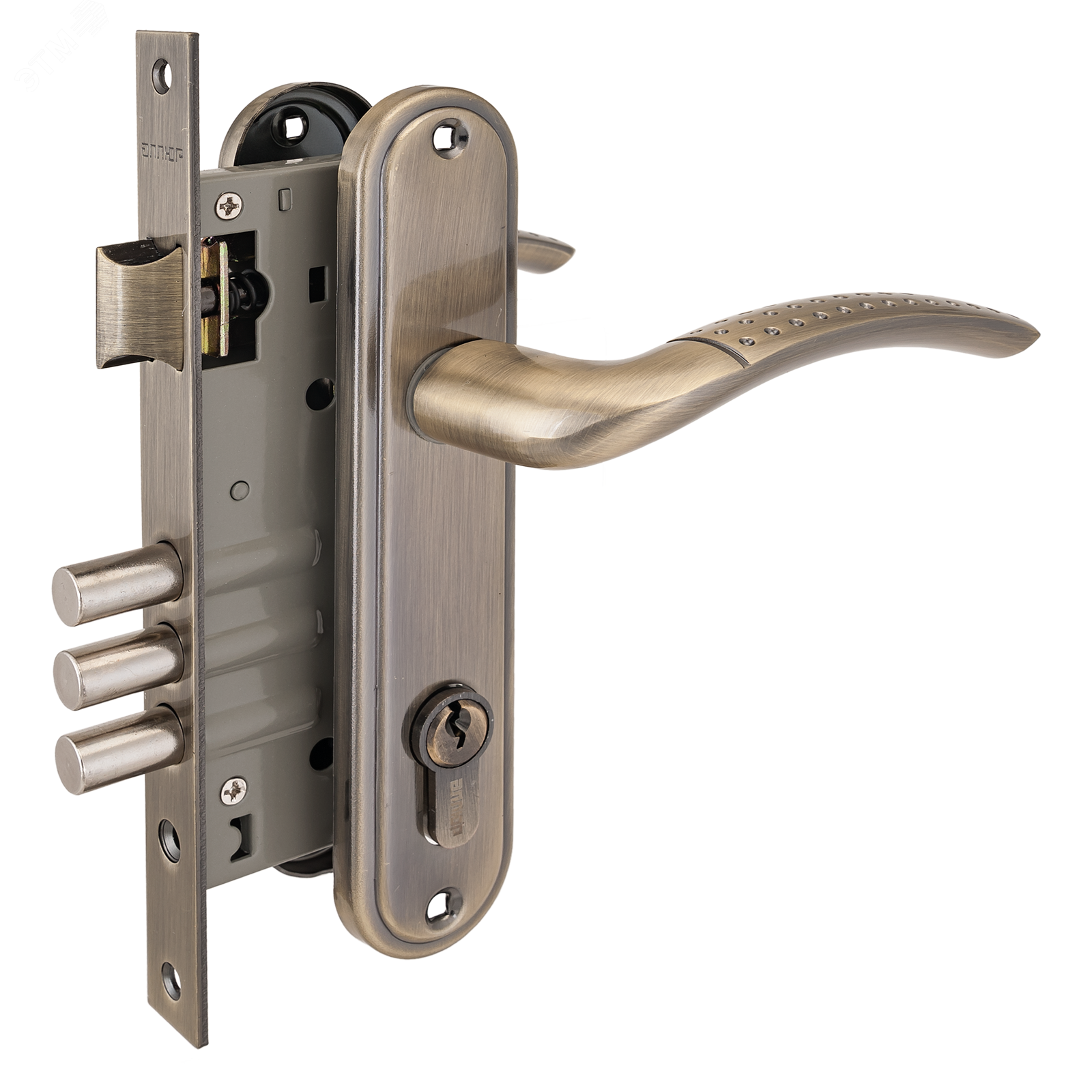 Замок врезной цилиндровый с ручками для деревянных дверей АЛЛЮР 132/3 AB старая бронза