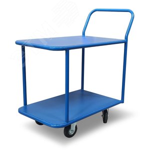 Платформенная двухъярусная 4-х колесная тележка КП-2 (2-х ярусная) используется для перевозки малогабаритных грузов. Платформы имеют металлический каркас накрытый металлическим листом толщиной 1,2мм. Размер платформы 700х1200мм. Расстояние между ярусами 480мм. Количество ярусов - два.Габаритная высота 1050мм.Покрытие металлических деталей тележки - полимерное. Цвет - синий.Тележка КП-2 (2-х ярусная) оснащена двумя поворотными и двумя неповоротными колесами, изготовленными из высококачественной литой резины, диаметром 200мм, комплектом крепежа. Две платформы позволяют удобно расположить перевозимые предметы.Тележка широко используется на складах, в торговых павильонах, а также в гостиничном и ресторанном бизнесе. Грузоподьемность до 550кг.
