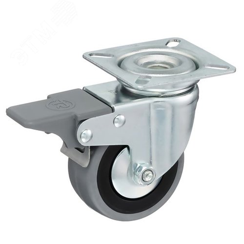 Колесо аппаратное из серой немаркой резины с сердечником из полипропилена, с металлической нитезащитой. В ступице колеса расположен подшипник скольжения. Поворотный кронштейн с креплением под площадку, оснащён с двухрядным подшипником. Тормоз блокирует, как вращение колеса, так и вращение самого кронштейна относительно площадки крепления. Идеально подходят для использования в магазинах, общественных учреждениях и в домашних условиях, в том числе на хрупких половых покрытиях. Примеры использования: тележки для супермаркетов, витрин, стенды в магазинах, инструментальные тележки, передвижная мебель офисная и домашняя мебель. Температурный режим эксплуатации от -5 до +40С.
