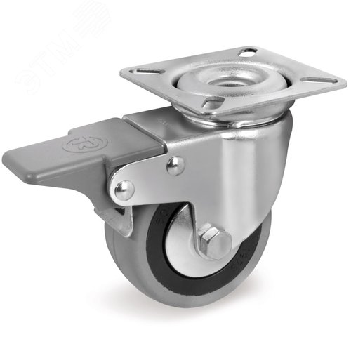 Колесо аппаратное из серой немаркой резины с сердечником из полипропилена, с металлической нитезащитой. В ступице колеса расположен подшипник скольжения. Поворотный кронштейн с креплением под площадку, оснащён с двухрядным подшипником. Тормоз блокирует, как вращение колеса, так и вращение самого кронштейна относительно площадки крепления. Идеально подходят для использования в магазинах, общественных учреждениях и в домашних условиях, в том числе на хрупких половых покрытиях. Примеры использования: тележки для супермаркетов, витрин, стенды в магазинах, инструментальные тележки, передвижная мебель офисная и домашняя мебель. Температурный режим эксплуатации от -5 до +40С.