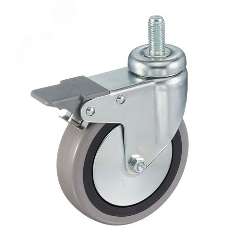 Колесо поворотное с тормозом, диаметр 125мм, грузоподъемность 80кг, серая резина, полипропилен, штырь с резьбой M12