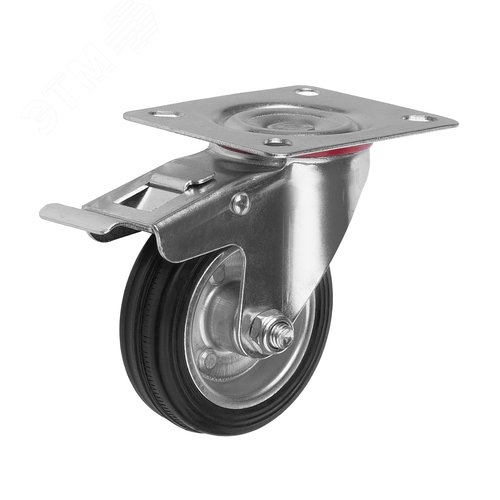 Колесо поворотное с тормозом 4003-75, диаметр 75мм., грузоподъемность 50кг. Колеса из черной литой резины, центр из двух гальванизированных дисков из штампованной стали. Роликовый (игольчатый) подшипник расположен в углублении, выдавленном под прессом, и содержит цилиндрические ролики подшипника. Кронштейн изготовлен прессованием из листовой стали. В поворотном узле двухрядный шарикоподшипник. Кронштейн оснащен тормозом, блокирующим вращение колеса и вилки, относительно площадки крепления. Возможно применение на относительно грубых полах складов, заводов, производственных и строительных площадках. Данные колеса можно использовать на неровных поверхностях, во влажной окружающей среде и использовании вне помещения, не рекомендуется применять в среде с органическими растворителями, хлорированными веществами, гидрокарбонатами и минеральными маслами. Температура эксплуатации от -20 до +70С.
