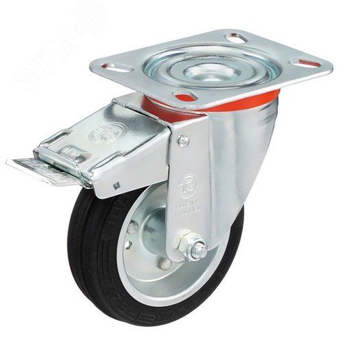 Колесо поворотное с тормозом промышленное из черной резины. Жесткость 80 шор А. Центр-сердечник состоит из двух гальванизированных дисков, соединённый прочными заклепками. Все элементы выполнены из высококачественной стали. Роликовый подшипник расположен в углублении, выдавленном под прессом, и содержит цилиндрические ролики подшипника в обойме из полиамида 6. Ступица оснащена игольчатым (роликовым) подшипником. Качественный поворотный кронштейн серии NL c двойным шарикоподшипником в основании, оснащен передним тормозом. Эта серия широко используется, с любыми тележками и контейнерами, легкой и стандартной грузоподъемности, для строительных лесов, а также для работы вне помещений. Для внутренних и внешних работ на складах и в промышленности, багажные тележки, для строительных лесов, контейнеры для мусора, электрооборудование. Температурный диапазон эксплуатации от -20 до +60С.