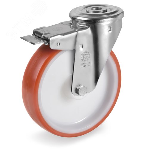 Колесо поворотное с передним тормозом из оцинкованной стали. Контактный слой из термопластичного полиуретана твердостью 55 Шор D. Основание: полиамид 6. Ступица оснащена подшипником скольжения (втулка). Качественный, поворотный оцинкованный кронштейн серии NL, оснащен двухрядным подшипником и передним тормозом. Полиуретановый слой значительно снижает шум и вибрацию, бережно относится к полам. Отличные характеристики сопротивлению качения и эластичности, высокая устойчивость к износу и сопротивляемости усилию на разрыв. Рекомендации для использования: пищевая и химическая промышленность. Легко моются и дезинфицируется. Температурный диапазон эксплуатации от -15 до +80С.