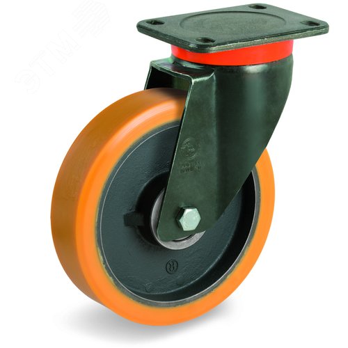 Колесо из полиуретана твердостью 95 Шор А. Контактный слой колеса изготавливается из качественного полиуретана серии TR. Этот материал очень прочен на разрыв, не трескается и способен выдерживать большие нагрузки. Сердечник колеса производятся из чугуна, что позволяет перемещать повышенные веса, даже на маленьком диаметре. Ступица колеса оснащена усиленным шариковым подшипником. Ударопрочный кронштейн EP оснащен коническими роликовыми подшипниками и способны выдерживать нагрузки до 550кг. на колесо. Возможно использование с электромеханической тягой на скорости до 16 км в час. Температурный диапазон эксплуатации от -20 до +80С.