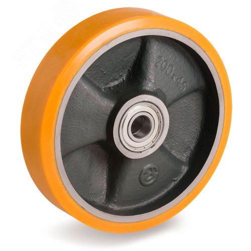 Колесо из полиуретана твердостью 95 Шор А. Контактный слой колеса изготавливается из качественного полиуретана серии TR. Этот материал очень прочен на разрыв, не трескается и способен выдерживать большие нагрузки. Сердечник колеса производятся из чугуна, что позволяет перемещать повышенные веса, даже на маленьком диаметре. Возможно использование с электромеханической тягой на скорости до 16 км в час. Рекомендации к использованию: тележки со стандартной и усиленной грузоподъемностью, тележки для работ в помещениях промышленности, автоматически управляемые тележки, электротранспортеры, электроштабелеры, полотеры, электро-медицинское оборудование, передвижные театральные конструкции, краны, в цехах тяжелой промышленности. Рекомендуемые опоры серии: M, P, PT, EP, EE MHD, EEG HD. Температурный диапазон эксплуатации от -20 до +80С.