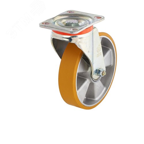 Колесо большегрузное поворотное из полиуретана TR твердостью 95 Шор А. Основание из высококачественного алюминия, отлитого под давлением. Ступица оснащена шариковым подшипником с распорной втулкой. Усиленный поворотный кронштейн серии P оснащен двумя рядами шарикоподшипников и стоек к боковым ударным нагрузкам. Увеличенный коэффициент жесткости полиуретанового слоя, относительно 62 серии, позволяет колесу выдерживать большие нагрузки. Полиуретановый слой марки TR обеспечивает превосходную плавность хода и позволяет с легкостью перевозить груз даже с применением колес маленького диаметра. Значительно снижает шум и вибрацию, обладает высокой износостойкостью, сопротивлением качению и усилию на разрыв.