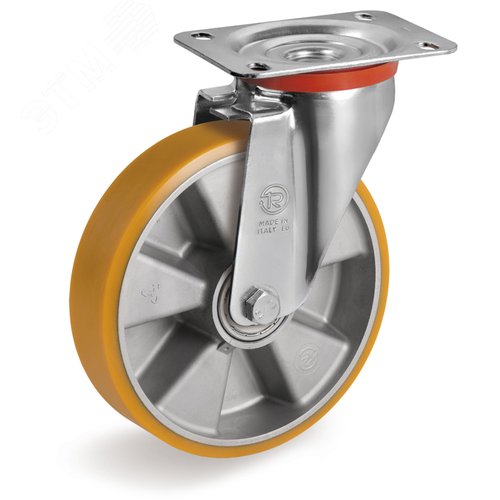 Колесо поворотное из полиуретана TR твердостью 95 Шор А. Основание из высококачественного алюминия, отлитого под давлением. Ступица оснащена шариковым подшипником с распорной втулкой. Поворотный кронштейн серии NL оснащен двумя рядами шарикоподшипников. Увеличенный коэффициент жесткости полиуретанового слоя, позволяет колесу выдерживать большие нагрузки. Полиуретановый слой марки TR обеспечивает превосходную плавность хода и позволяет с легкостью перевозить груз даже с применением колес маленького диаметра. Значительно снижает шум и вибрацию, обладает высокой износостойкостью, сопротивлением качению и усилию на разрыв. Бережно относится к полам, не оставляет следов и не разрушает поверхности во время перемещения. Возможно использование с электромеханической тягой на скорости до 6 км в час.