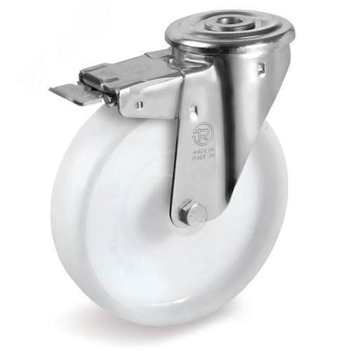 Колесо из полиамида поворотное твердостью 70 Шор D. Основание: монолитное полиамид 6. Ступица оснащена подшипником скольжения. Качественный поворотный оцинкованный кронштейн с тормозом серии NL оснащен двухрядным подшипником. Тормоз блокирует вращение колеса, а так же вращение самого кронштейна относительно площадки крепления. Легко моются и дезинфицируется. Устойчивы к агрессивной химической среде. Допустима эксплуатация в морозильных камерах. Температурный диапазон эксплуатации от -30 до +80С. Используются преимущественно для малоподвижных объектов со средней грузоподъемностью. Плавность движения, на гладких и ровных поверхностях, гарантирует минимальное усилие при ручном движении.
