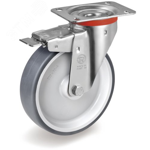Колесо из термопластичной серой резины твердостью 85 Шор А. Основание: полипропилен. Ступица оснащена игольчатым подшипником скольжения. Поворотный кронштейн серии NL, оснащен передним тормозом. Тормоз блокирует вращение колеса и вращение вилки относительно площадки крепления. Шина из серой резины, не оставляющей следов, бережно относится к декоративному и хрупкому напольному покрытию в общественных учреждениях, офисных и торговых помещениях. Превосходное скольжение гарантирует минимальное усилие при ручном передвижении. Возможно использование в агрессивных химических средах. Рекомендации для использования: тележки для багажа, для инструментов, для общественных учреждений и пунктов общественного питания, тележки для внутреннего промышленного применения, трубчатые тележки. Температурный диапазон эксплуатации от -20 до +70С. Грузоподъёмность на тележку с четырьмя колесами-до 360кг.