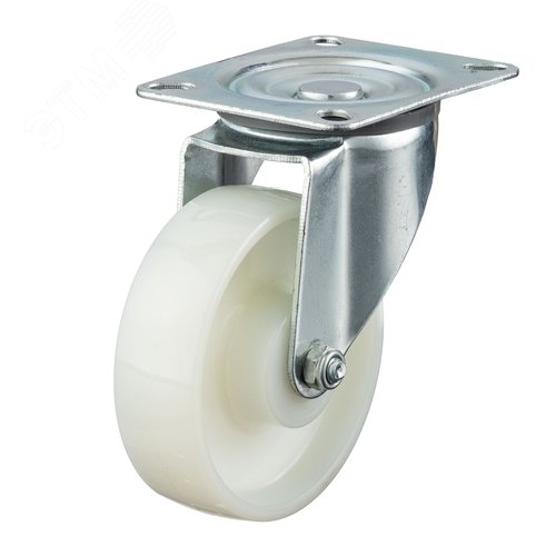 Колесо из полиамида поворотное твердостью 70 Шор D. Основание: монолитное полиамид 6. Ступица оснащена подшипником скольжения. Поворотный оцинкованный кронштейн оснащен двухрядным подшипником. Легко моются и дезинфицируется. Устойчивы к агрессивной химической среде. Допустима эксплуатация в морозильных камерах. Температурный диапазон эксплуатации от -15 до +80С. Используются преимущественно для малоподвижных объектов со средней грузоподъемностью. Плавность движения, на гладких и ровных поверхностях, гарантирует минимальное усилие при ручном движении. Примеры рекомендуемой эксплуатации: тележки для внутренней транспортировки на предприятиях пищевой и химической промышленности, оборудование для кожевенных заводов, тележки для перевозки цветов, погрузчики для транспортировки поддонов, подвижные строительные леса