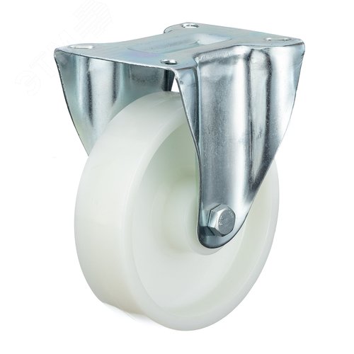 Колесо из полиамида поворотное твердостью 70 Шор D. Основание: монолитное полиамид 6. Ступица оснащена подшипником скольжения. Поворотный оцинкованный кронштейн оснащен двухрядным подшипником. Легко моются и дезинфицируется. Устойчивы к агрессивной химической среде. Допустима эксплуатация в морозильных камерах. Температурный диапазон эксплуатации от -15 до +80С. Используются преимущественно для малоподвижных объектов со средней грузоподъемностью. Плавность движения, на гладких и ровных поверхностях, гарантирует минимальное усилие при ручном движении. Примеры рекомендуемой эксплуатации: тележки для внутренней транспортировки на предприятиях пищевой и химической промышленности, оборудование для кожевенных заводов, тележки для перевозки цветов, погрузчики для транспортировки поддонов, подвижные строительные леса