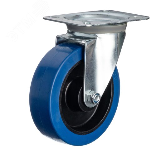 Колесо из эластичной синей резины твердостью 70 Шор А. Основание: полипропилен. Ступица оснащена игольчатым подшипником. Кронштейн выполнен из оцинкованной стали, что позволяет минимизировать риск возникновения коррозии. В поворотном механизме установлен двухрядный шариковый подшипник, площадка под 4 болта. Шина из синей резины, не оставляет следов, бережно относится к декоративному и хрупкому напольному покрытию в общественных учреждениях, офисных и торговых помещениях. Превосходное скольжение гарантирует минимальное усилие при ручном передвижении, можно использовать для оснащения тележек для багажа, для инструментов, для общественных учреждений и пунктов общественного питания, тележки для внутреннего промышленного применения, трубчатые тележки. Температурный диапазон эксплуатации от -5 до +70С.