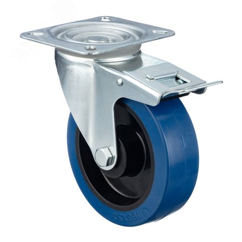 Колесо из эластичной синей резины твердостью 70 Шор А. Основание: полипропилен. Ступица оснащена игольчатым подшипником. Кронштейн выполнен из оцинкованной стали, что позволяет минимизировать риск возникновения коррозии. В поворотном механизме установлен двухрядный шариковый подшипник, площадка под 4 болта. Шина из синей резины, не оставляет следов, бережно относится к декоративному и хрупкому напольному покрытию в общественных учреждениях, офисных и торговых помещениях. Превосходное скольжение гарантирует минимальное усилие при ручном передвижении, можно использовать для оснащения тележек для багажа, для инструментов, для общественных учреждений и пунктов общественного питания, тележки для внутреннего промышленного применения, трубчатые тележки. Температурный диапазон эксплуатации от -5 до +70С.