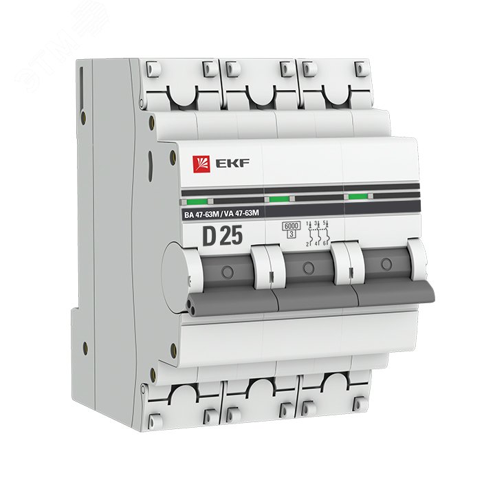 Автоматический выключатель 3P 25А (D) 6кА ВА 47-63M c одним магнитным расцепителем EKF mcb4763m-6-3-25D-pro