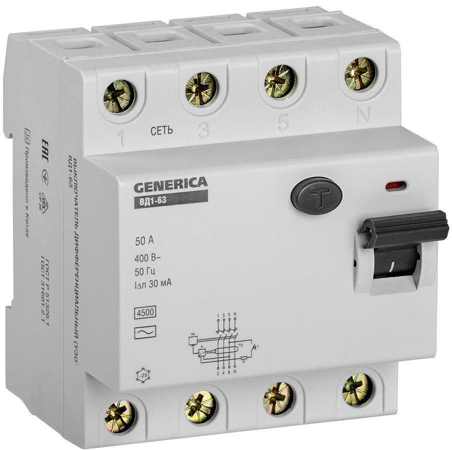 Выключатель дифференциальный (УЗО) ВД1-63 4Р 50А 30мА GENERICA