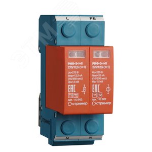 Двухполюсное УЗИП класса I+II комбинированного типа. УЗИП выполнено из одного сменного варисторного модуля, одного модуля с разрядником и базы для подключения к сети и креплению на DIN-рейку 35 мм. УЗИП выдерживает токовые нагрузки, соответствующие УЗИП класса I, а по способности ограничения импульсных напряжений, допустимых для изоляции оборудования, соответствует УЗИП класса II. Устанавливается в пределах 0А(В) – 1 зон молниезащиты (в соответствии с ГОСТ Р МЭК 62305-1 и СО-153-34.21.122). Применяется для сетей с системами заземления - TN-S, TT. Рекомендуемый номинал предохранителя не менее 125 А gL/gG.