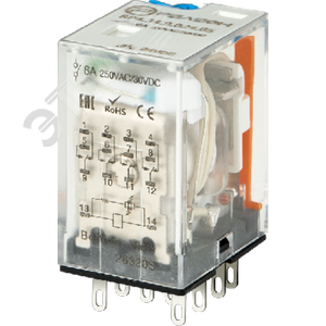 Промежуточное реле, 4 перекидных контакта 6А, 24В (DC), блокируемая кнопка проверки, 2 светодиода, диод (A1+)