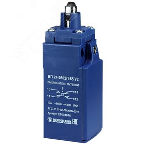 Выключатель путевой ВП 24-2121П-65 У2, рычаг с пластиковым роликом горизонтального срабатывания, 1з+1р, безинерционный, 20 мм, без сальника, 3А, IP65