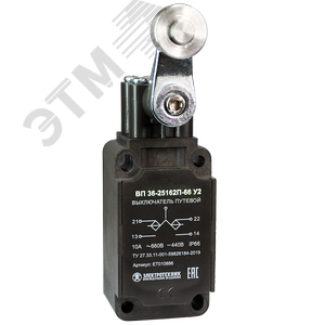 Выключатель путевой ВП 36-2516П-66 У2, рычаг со стальным роликом, 1з+1р, инерционный, 30х60 мм, без сальника, 3А, IP66