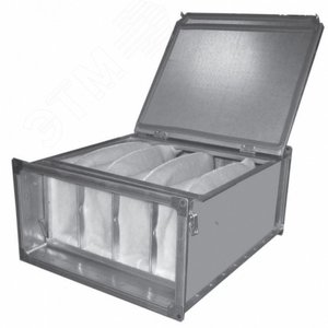 Корпус и крышка фильтра изготовлены из оцинкованной стали. Крышка фильтра крепится к корпусу простыми защёлками, корпус фильтров с обеих сторон снабжён фланцами, что обеспечивает лёгкое подсоединение к воздуховодам или другим компонентам систем вентиляции. Фильтрующий материал выполнен в виде кассеты с мешочными фильтрами из синтетического волокна, имеющего класс очистки EU4, EU5, EU7. Устанавливается в горизонтальном или вертикальном положении. При вертикальном монтаже воздушный поток должен быть направлен вниз так, что бы карманы фильтра не сминались. Рекомендуемое конечное аэродинамическое сопротивление для фильтров EU5-200 Па, для фильтров EU7-250 Па. Под навесной крышкой находится быстроразъёмный фиксатор, позволяющий легко заменить фильтр. Мешочные фильтры для прямоугольных каналов предназначены для фильтрации воздуха при высокой интенсивности потока в прямоугольных воздуховодах.