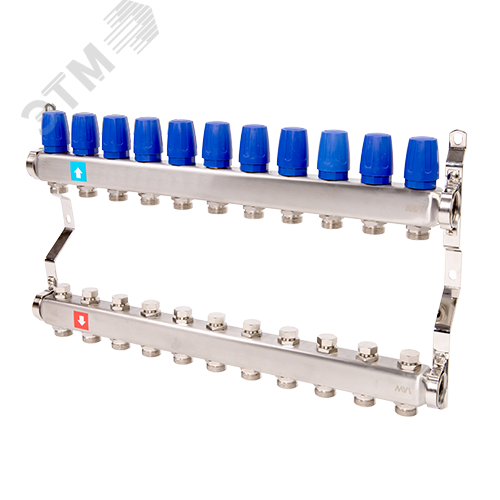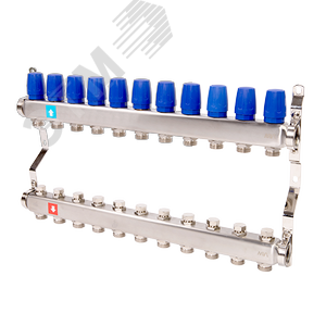Коллекторные блоки предназначены для распределения потока рабочей среды систем водяного отопления по потребителям. При этом под 'потребителем' понимается отдельный нагревательный прибор или группа приборов, контур или петля 'теплого пола', отдельные части или ветви системы. Коллекторный блок объединяет в себе подающий и обратный коллекторы из нержавеющей стали, ручные настроечные клапаны c расходомерами, термостатические клапаны (с возможностью установки электротермического сервопривода) и крепежные кронштейны. Коллекторные блоки могут работать как на водяном, так и низкозамерзающем (гликолевом) теплоносителе. Коллекторные блоки выпускаются с количеством выходов от 2 до 12.