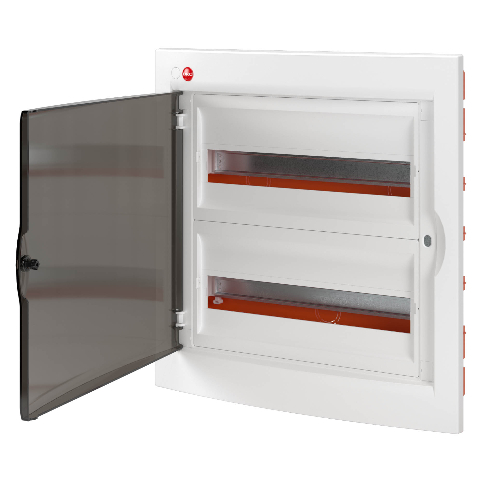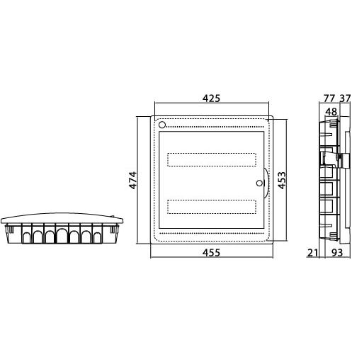 Встраиваемый распределительный щиток ДКС предназначен для монтажа в жилых и административных помещениях для установки автоматических выключателей любых производителей: таймеров, устройств защитного отключения и управления освещением и т.д. Щиток имеет оцинкованную DIN-рейку и суппорт, заглушки для пустых модулей, сборочные винты и заглушки для них, самоклеящуюся этикетку для маркировки цепей. Преперфорированные отверстия и насечки на задней стенке обеспечивают точное соединение с пластиковыми трубами и обеспечивают легкий монтаж. Два усиленных клеммных блока 87308 в комплекте с крепежом, для коммутации питающих линий, жил проводов и кабелей. Дверца выполнена из затемненного полупрозрачного пластика. Специальная конструкция петель дает возможность открывать дверцу более чем на 180°. Степень пыле- и влагозащиты IP 41. Количество модулей - 36. Параметры щитка: ширина - 425 мм, высота - 474 мм, глубина встраиваемой части - 77 мм. Материал - термостойкий и ударопрочный пластик. Цвет - белый.