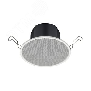 Громкоговоритель должен быть потолочного типа и состоять из двух частей, включающих внутреннюю сетчатую решетку и шасси со встроенным громкоговорителем без видимых креплений и незаметным внешним ободком толщиной всего 5 мм. Вторая часть должна представлять собой стальной противопожарный купол для предотвращения распространения дыма или огня через потолочные пустоты в чрезвычайной ситуации. Установка осуществляется с помощью предварительно установленных пружин, позволяющих монтировать его в потолок толщиной от 5 до 25 мм (0,2' - 0,98'). Должен быть предоставлен шаблон для помощи в вырезании монтажных отверстий. Громкоговоритель включает один полнодиапазонный конусный излучатель диаметром 12 см (5') с ровной частотной характеристикой от 200 Гц до 20 кГц с широкоугольной дисперсией.