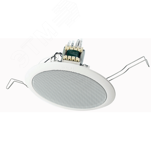 Потолочный громкоговоритель должен быть вмонтирован в конусный диффузор, линейный трансформатор и перегородку (решетку радиатора) в сборе. Динамик имеет конус диаметром 16 см (6) с номинальным сопротивлением 8 Ом и ферритовый магнит. Мощность должна 6 Вт (программа - 15 Вт) с частотной характеристикой от 65 до 18 кГц и чувствительностью 90 дБ SPL на входе 1 Вт, измеренной на расстоянии 1м. Линейный трансформатор принимает входы 70 В и 100 В с ответвителями на 1 Вт, 3 Вт и 6 Вт с выходным сопротивлением 8 Ом. Передняя панель изготовлена из полипропиленовой смолы, а решетка радиатора покрыта сеткой из листовой стали небелого цвета (RAL9010) с поверхностной обработкой. С двумя пружинными зажимами, установленными на противоположной стороне передней панели для удобства монтажа. Громкоговоритель имеет диаметр 192 мм, глубину 73 мм и вес 500 г. Потолочный громкоговоритель установлен в модели TOA PC-658R.