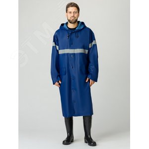 Плащ из прочного, но при этом мягкого и эластичного материала на трикотажной основе с покрытием ПВХ плотностью 280- 350г и толщиной 0.33-0.5мм, с герметичными сварными швами. Конструкция плаща, материал, из которого он изготовлен, и сварные швы обеспечивают защиту от воды, ветра, сырой нефти и нефтепродуктов. Благодаря морозостойкости материала плащ можно носить при низких температурах. Застежка на кнопки. Боковые прорезные карманы с клапаном, под кокеткой спинки - отверстия для вентиляции пододежного пространства, закрытые клапанами с перфорацией. Объем капюшона позволяет надевать его на каску. Кнопка по низу рукава позволяет заузить рукав. Светоотражающие полосы по груди, спине и рукавам, позволяют быть заметным в темное время суток.