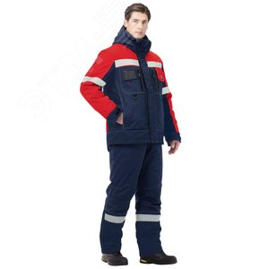 Костюм мужской утепленный. Состоит из куртки и брюк. Куртка с центральной застежкой на молнию под ветрозащитной планкой. Нагрудные карманы на молнии. Карман для телефона или рации. Съемное окно под бейдж с креплением на карабине. Нижние утепленные карманы. Рукава с регулировкой по низу и внутренними трикотажными манжетами. Капюшон съемный, с регулировкой. Вместительный карман для документов формата А4 под планкой. Внутри куртки - карман из трикотажной сетки для шапки и перчаток, карман с молнией для телефона, ветрозащитный пояс с застежкой на кнопки. По низу куртки - регулировка объема кулисой. Брюки с застежкой на молнию и пуговицы на поясе, с отстегивающейся утепленной спинкой. Боковые и задние карманы с клапанами. По низу брючин - внутренние пуфты и застежка на молнии под планками. На куртке и по низу брюк – широкие световозвращающие полосы для работы в условиях плохой видимости.