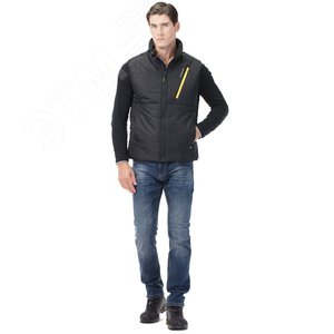 Жилет утепленный с центральной застежкой на реверсивную молнию. Вместительный карман на яркой водоотталкивающей молнии для документов, карточек. В нижней части жилета – утепленные карманы на молнии. По низу плечевых кокеток спереди и на спинке – световозвращаюшие канты, для эксплуатации в условиях плохой видимости. Для защиты шеи от холода – воротник-стойка с подкладкой из теплого мягкого флиса. Ветрозащитная внутренняя планка со стежкой – для исключения застревания ткани в молнии при застегивании жилета. Спинка жилета со стежкой. Шлевка с кнопкой под воротником, для крепления жилета к петле-вешалке на куртке или ветровке, в качестве дополнительного утепляющего слоя. Внутри жилета – карман на молнии для телефона или небольшого планшета. По низу жилета кулиса для регулировки объема.