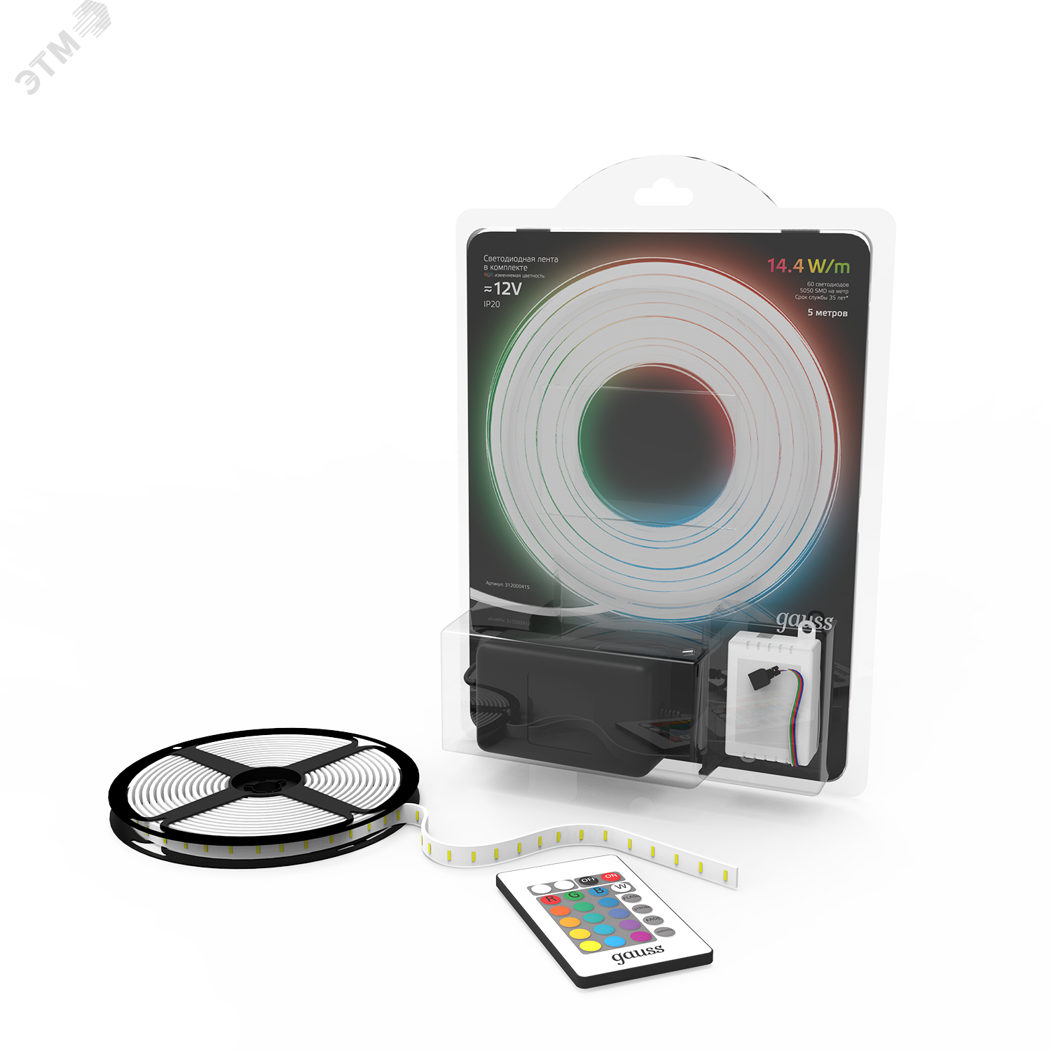 Лента светодиодная LED (комплект лента и драйвер) 5050/60-SMD 14,4 Вт/м 660 Лм/м RGB IP20 12 В DC 8 мм (блистер 5 м) Black Gauss